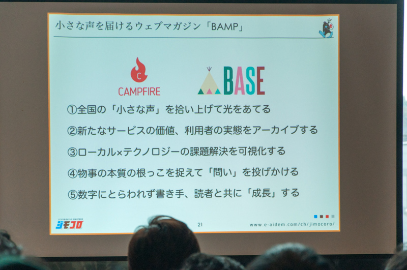 ジモコロの代表作はザッとこんなところなんですけど、さっき紹介してもらった「小さな声を届けるWEBマガジンBAMP」っていうのも一応ローカルメディアみたいな位置づけです。