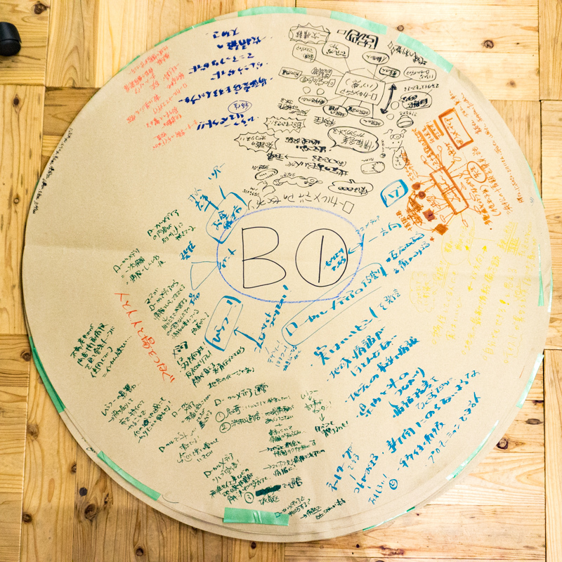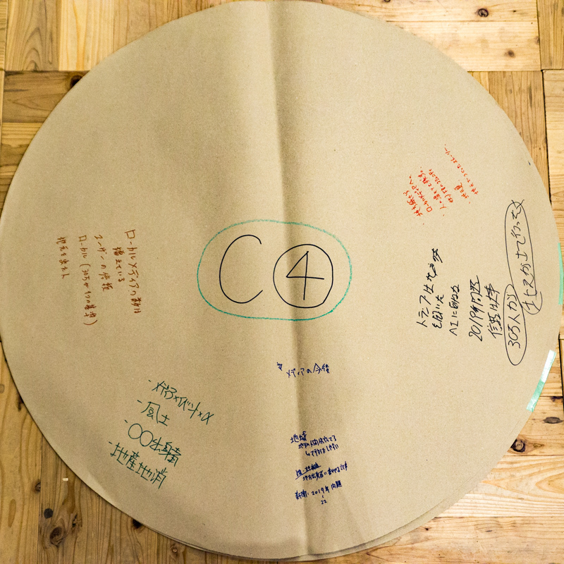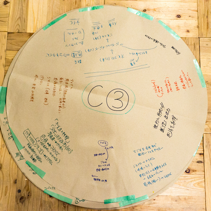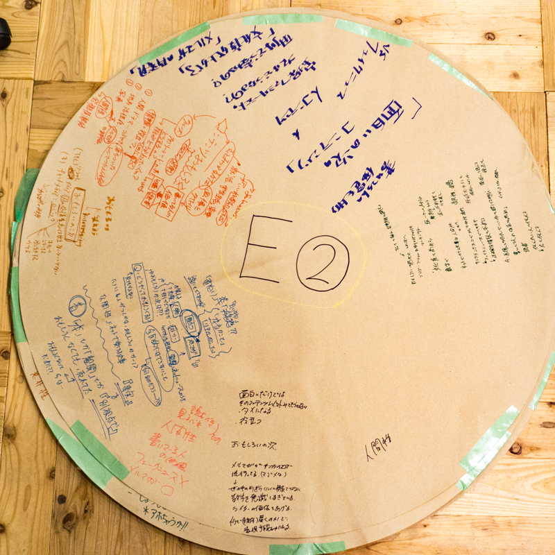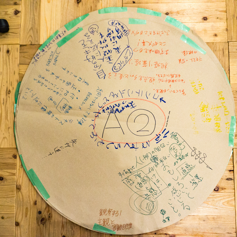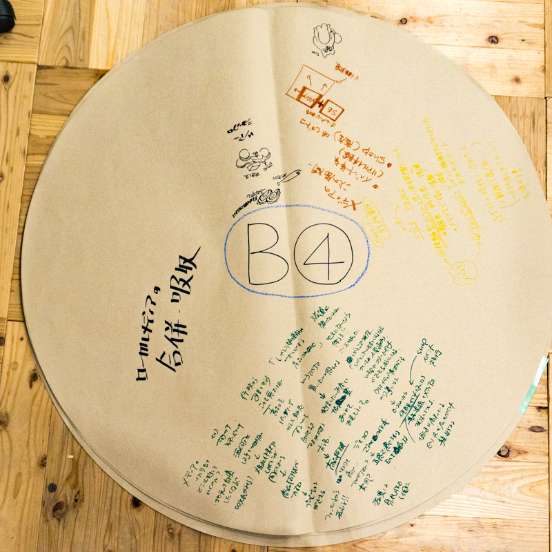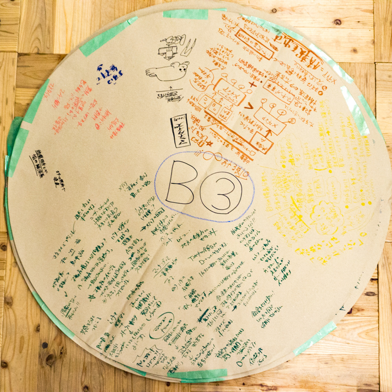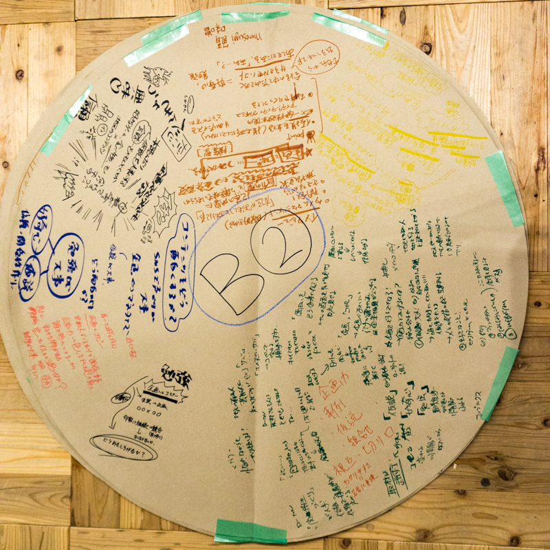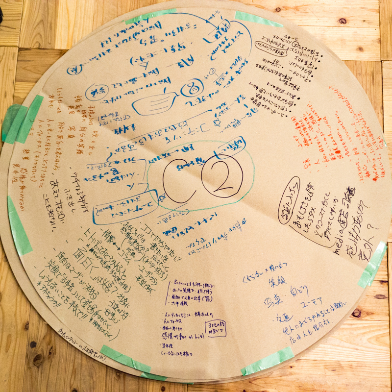 ▶︎今回は「えんたくん」という丸いダンボールに丸い模造紙を置いて、それぞれが話した内容や思ったこと、考えたことを自由に書き込んで行き、最終的に話した内容が記録されるというツールを使用しました。