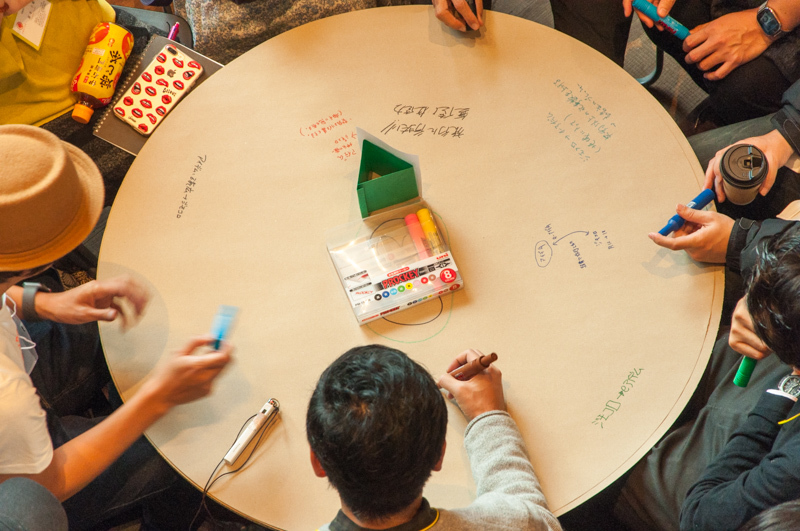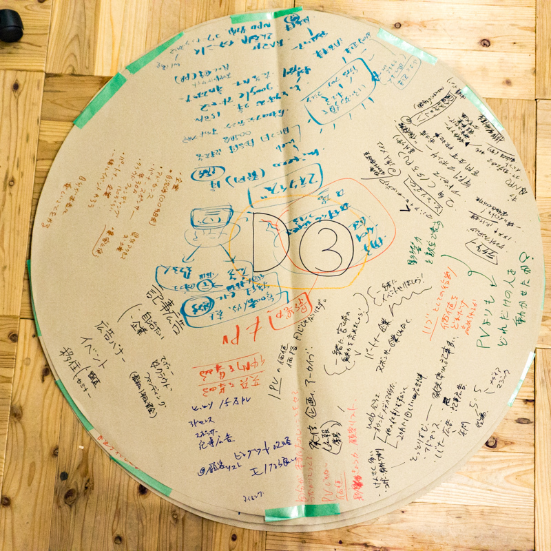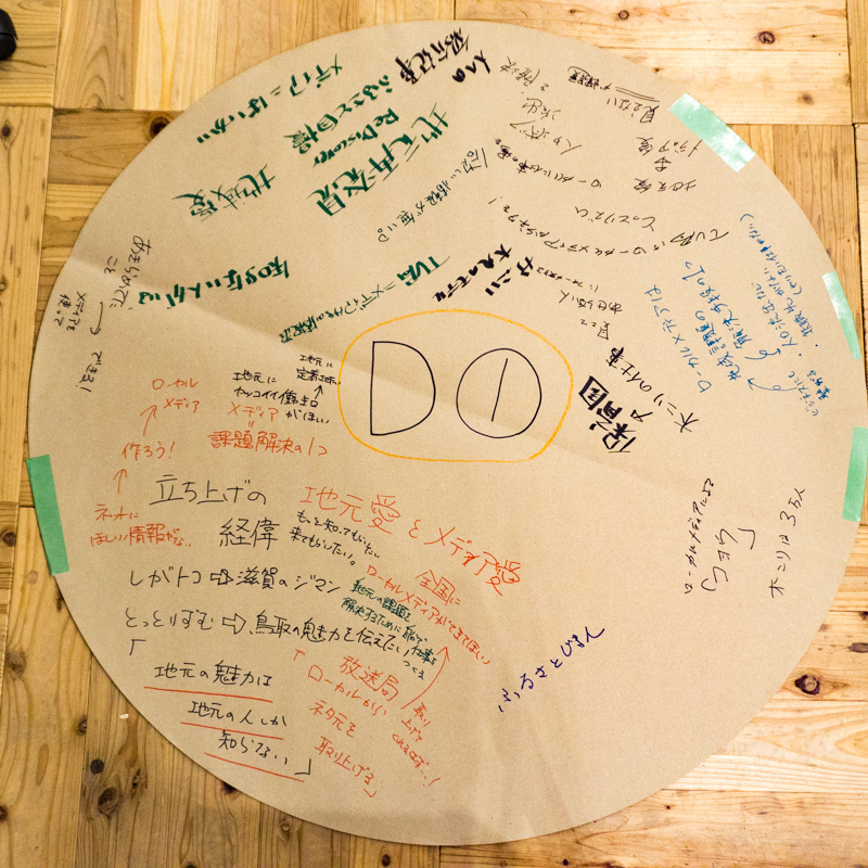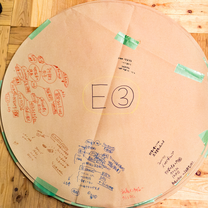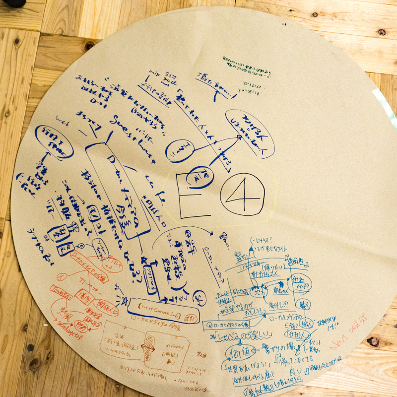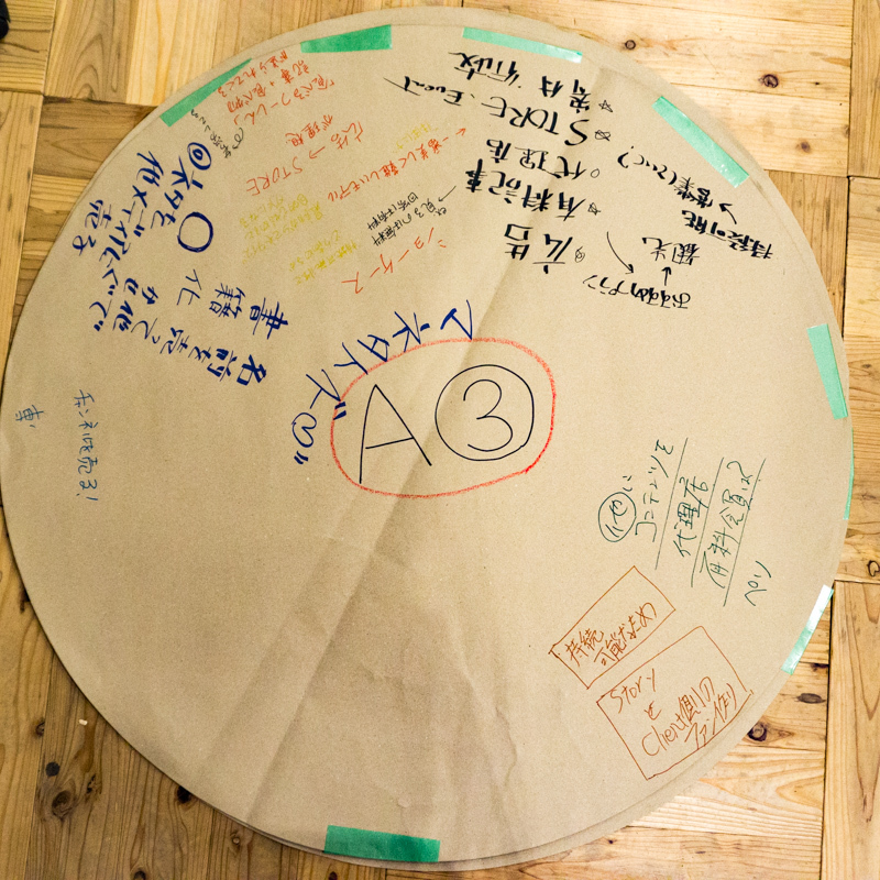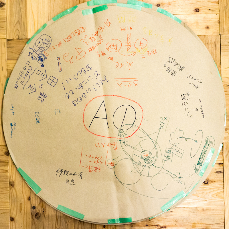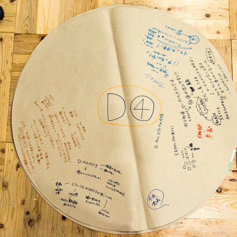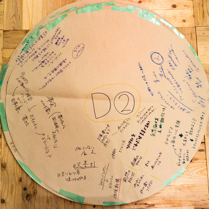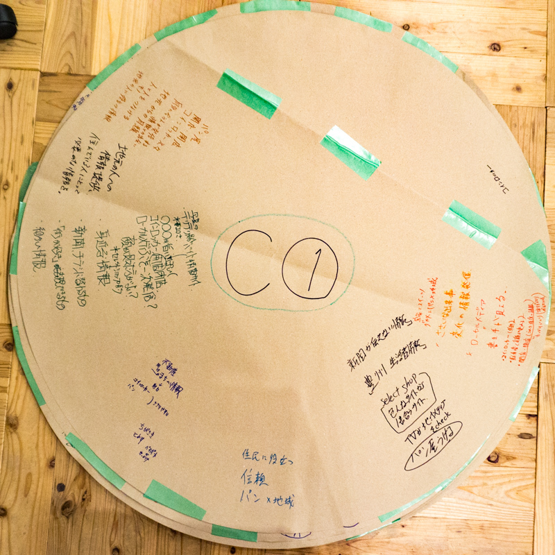 ▶︎今回は「えんたくん」という丸いダンボールに丸い模造紙を置いて、それぞれが話した内容や思ったこと、考えたことを自由に書き込んで行き、最終的に話した内容が記録されるというツールを使用しました。