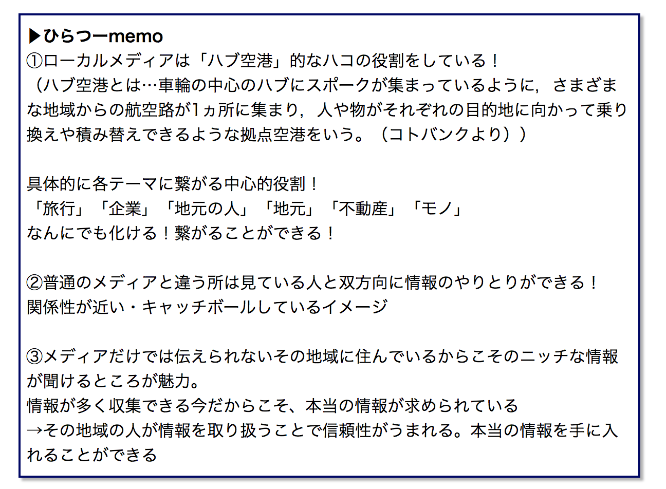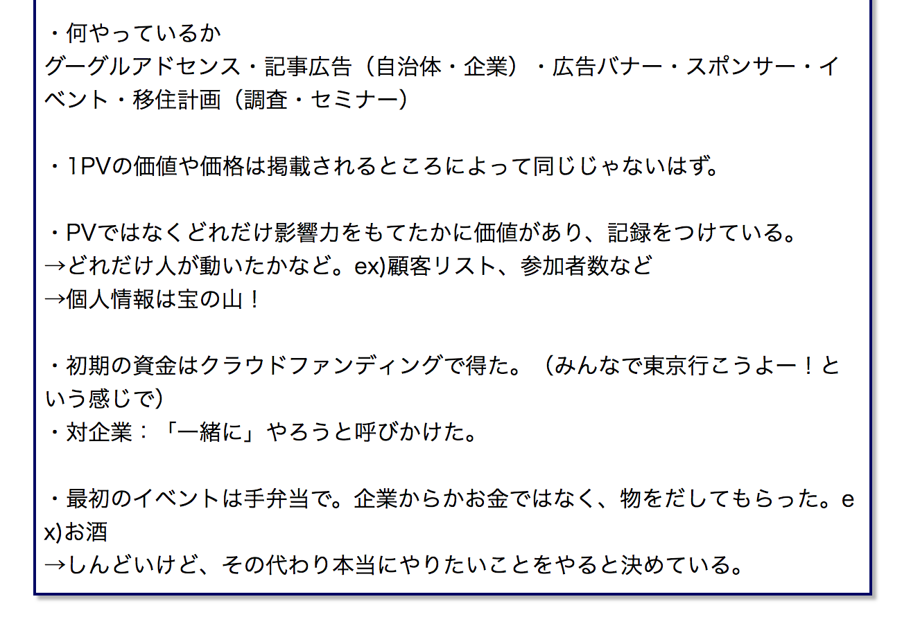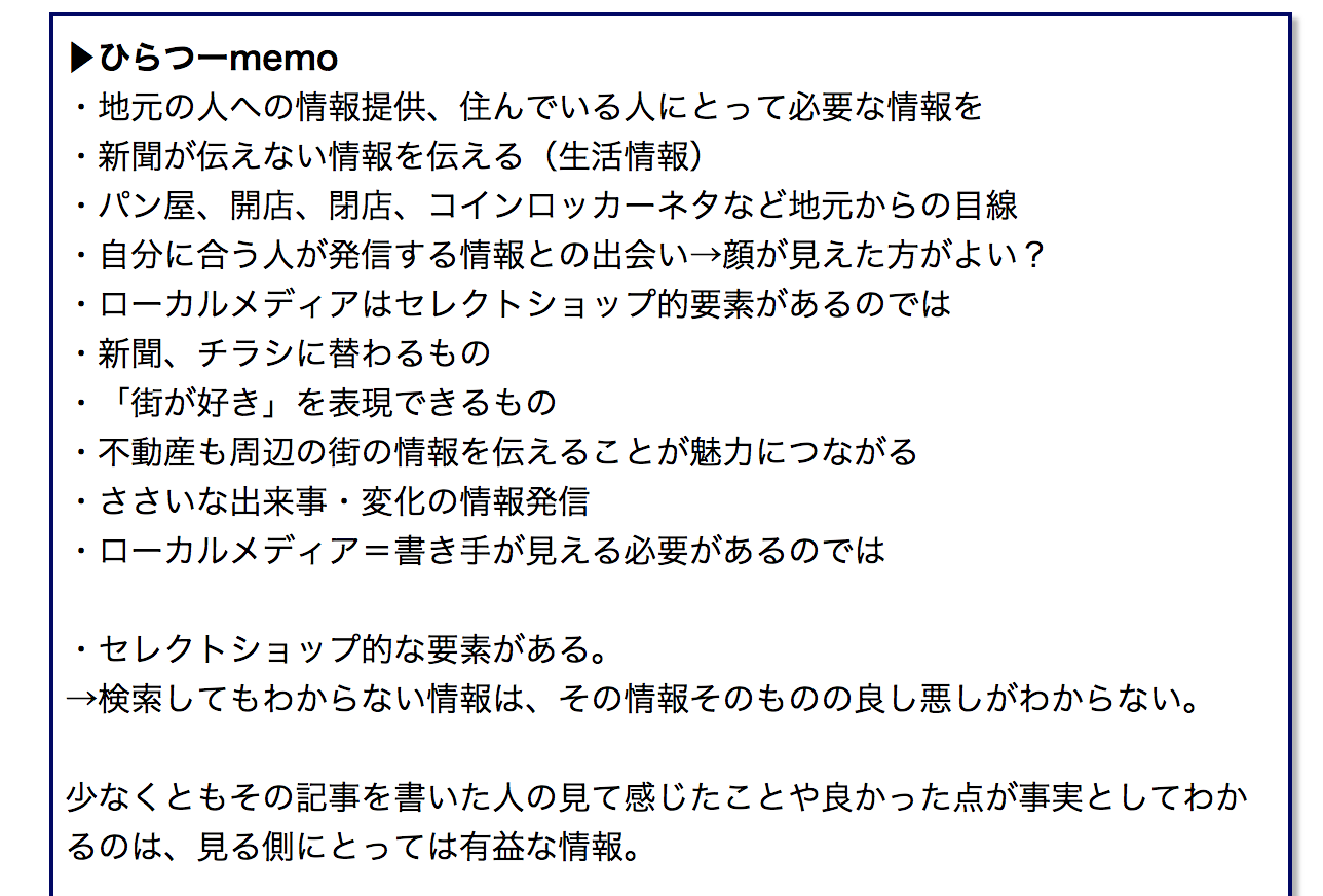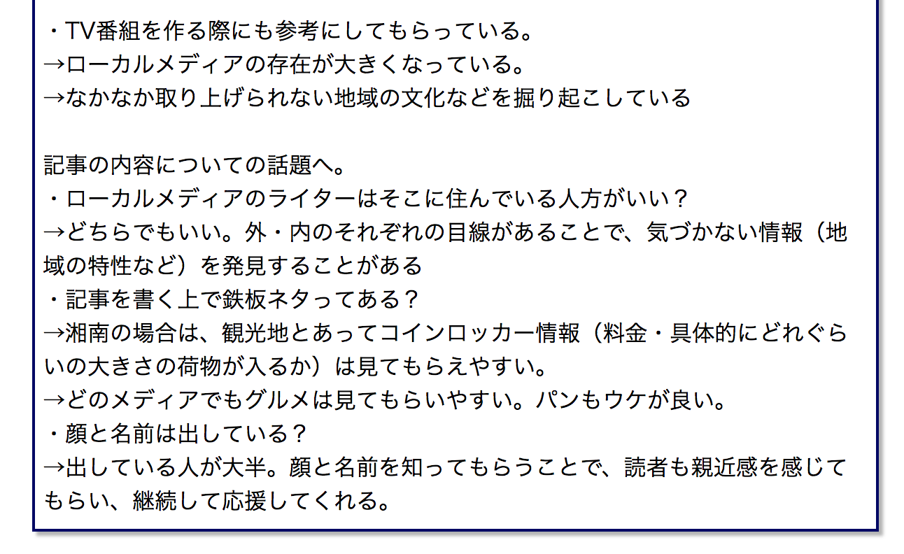 一方でネタの幅が狭いといいますか、同じ土地をずっとやっているとどうしてもネタがなくなっていったりとか、地域の新聞社の人が全然ネタがなくて毎日探してるみたいなことになっていくのでそこの持続性というか続けるのは大変な部分もあるのかなと。