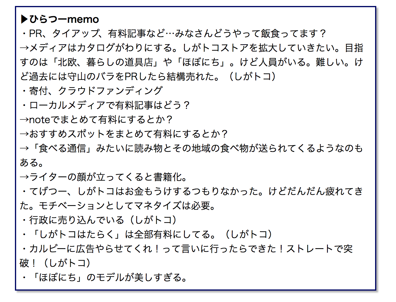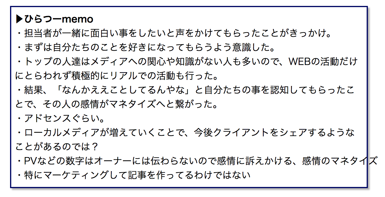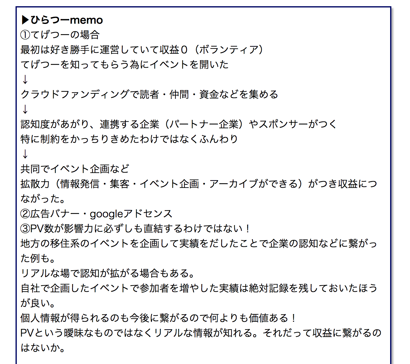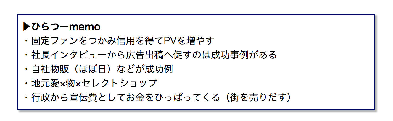 ひらつーさんもそうかもしれないですけど空間とかWEBだけにこだわらないでフリーマガジン作ってみるみたいなそういう横展開。時間も手間もかかっちゃうんですけど横展開していくことによってメディアの名前がどんどん広がっていくと。