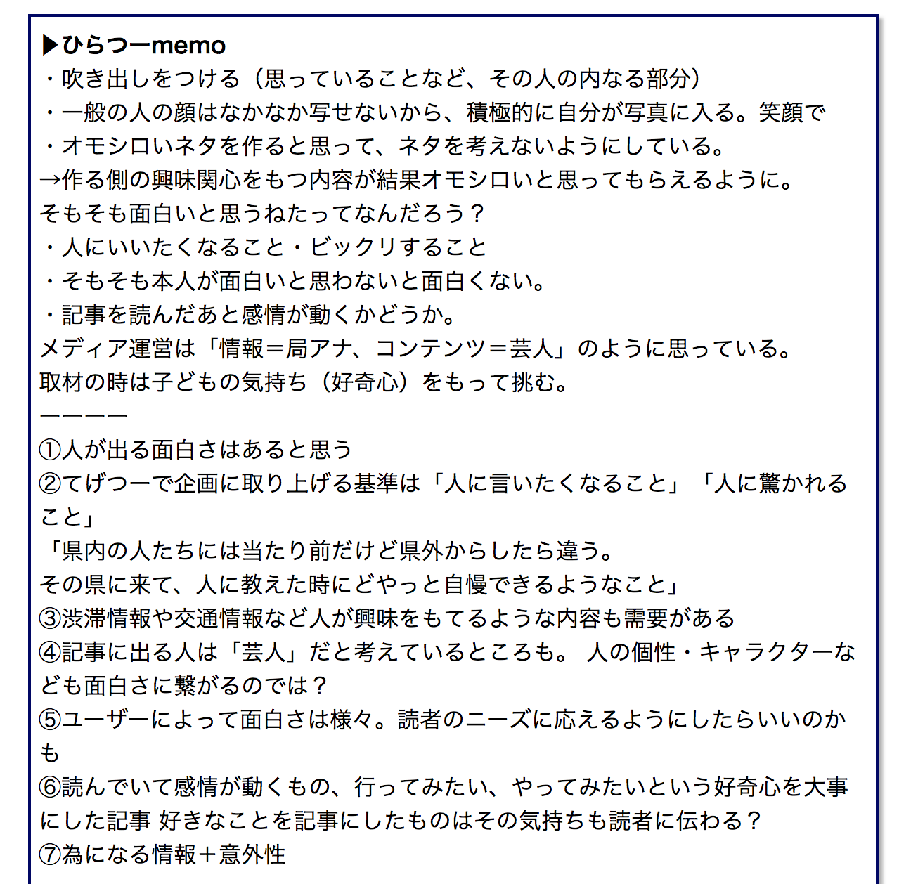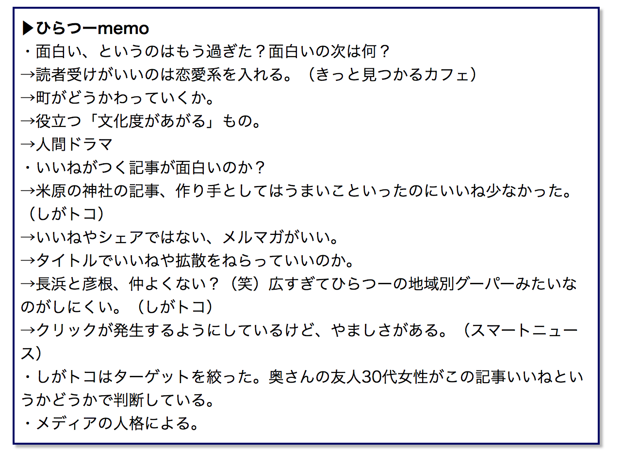 ジモコロに関わりたいとかジモコロで書きたいっていうようなライターさんからジモコロでやったらこんなことできますよって言わせるようなものって、ジモコロらしさが読んでる人に伝わっている、それがイコール文化ってことなんですけど、その文化を作っていけばさっきの体制づくりとかもやりやすくなっていくんですよね。
