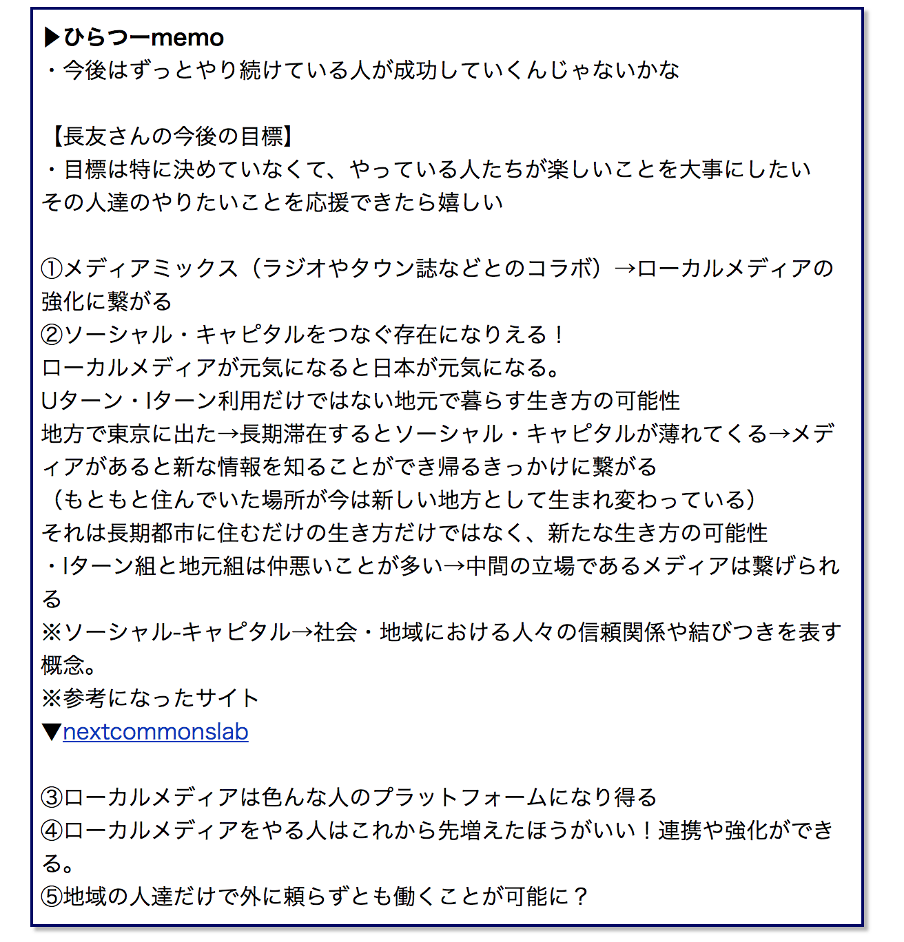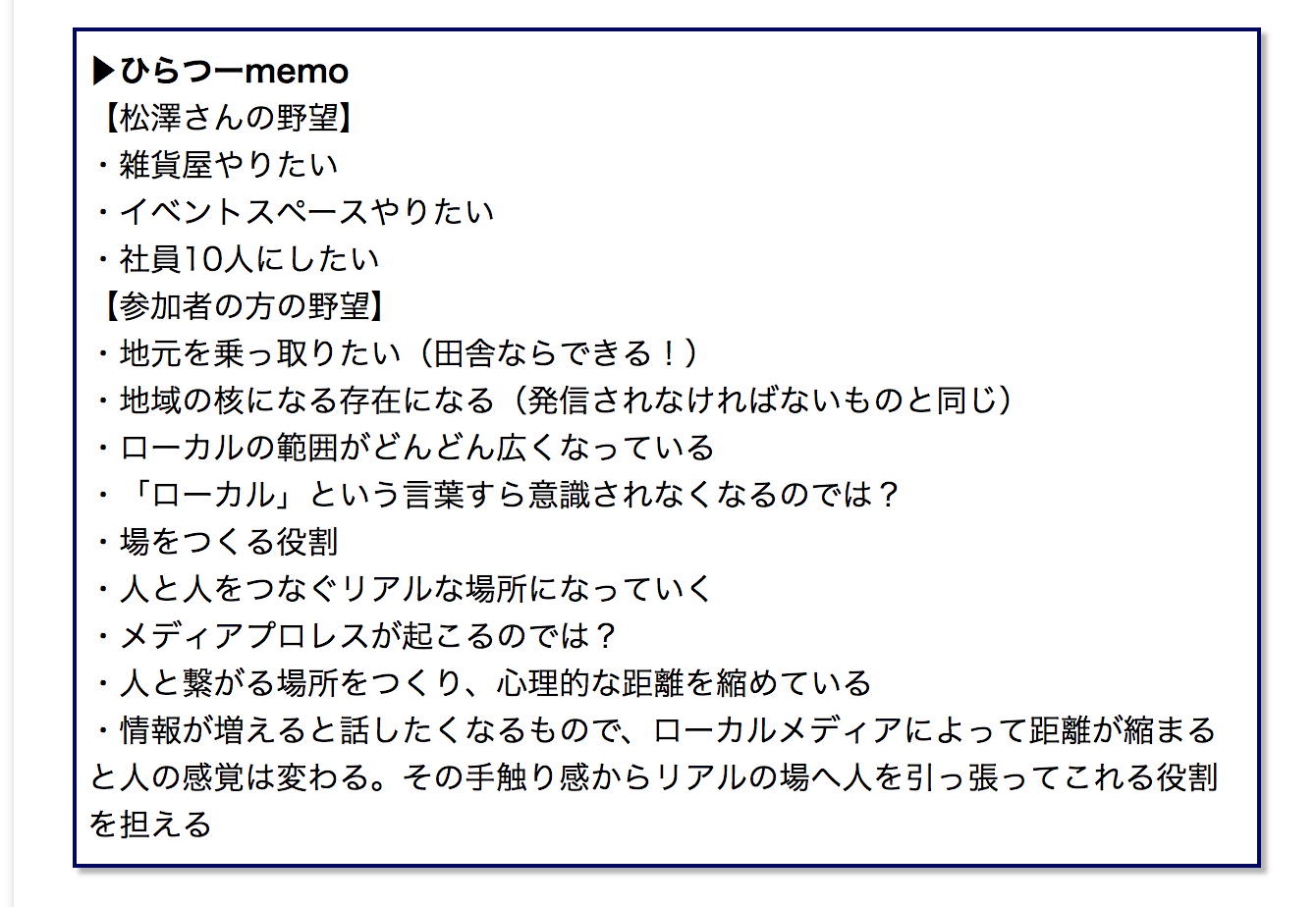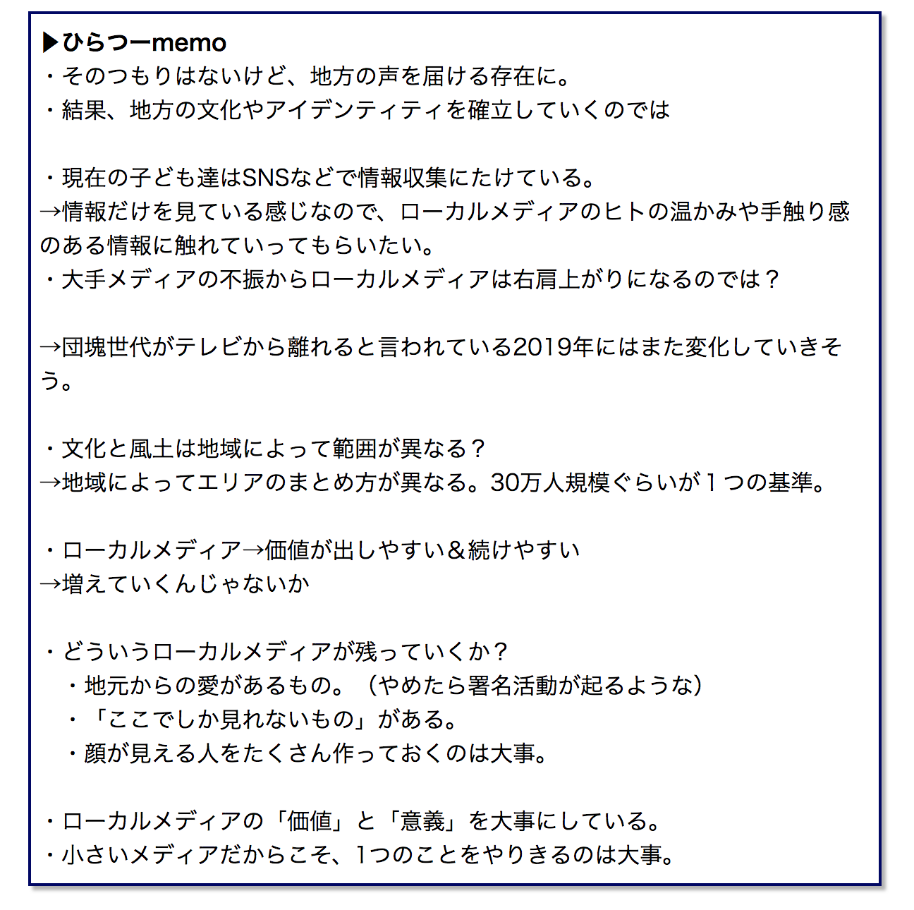 文化があればお金で買えるってこともやりやすくなったりするので、近道しないで遠回りしながら価値を追い求めるっていうことをローカルメディアはやっていった方が最終的にはやりがいといいますか関わってる全員が楽しくなったりするので、それはすごく大事なことなんじゃないかなと思います。