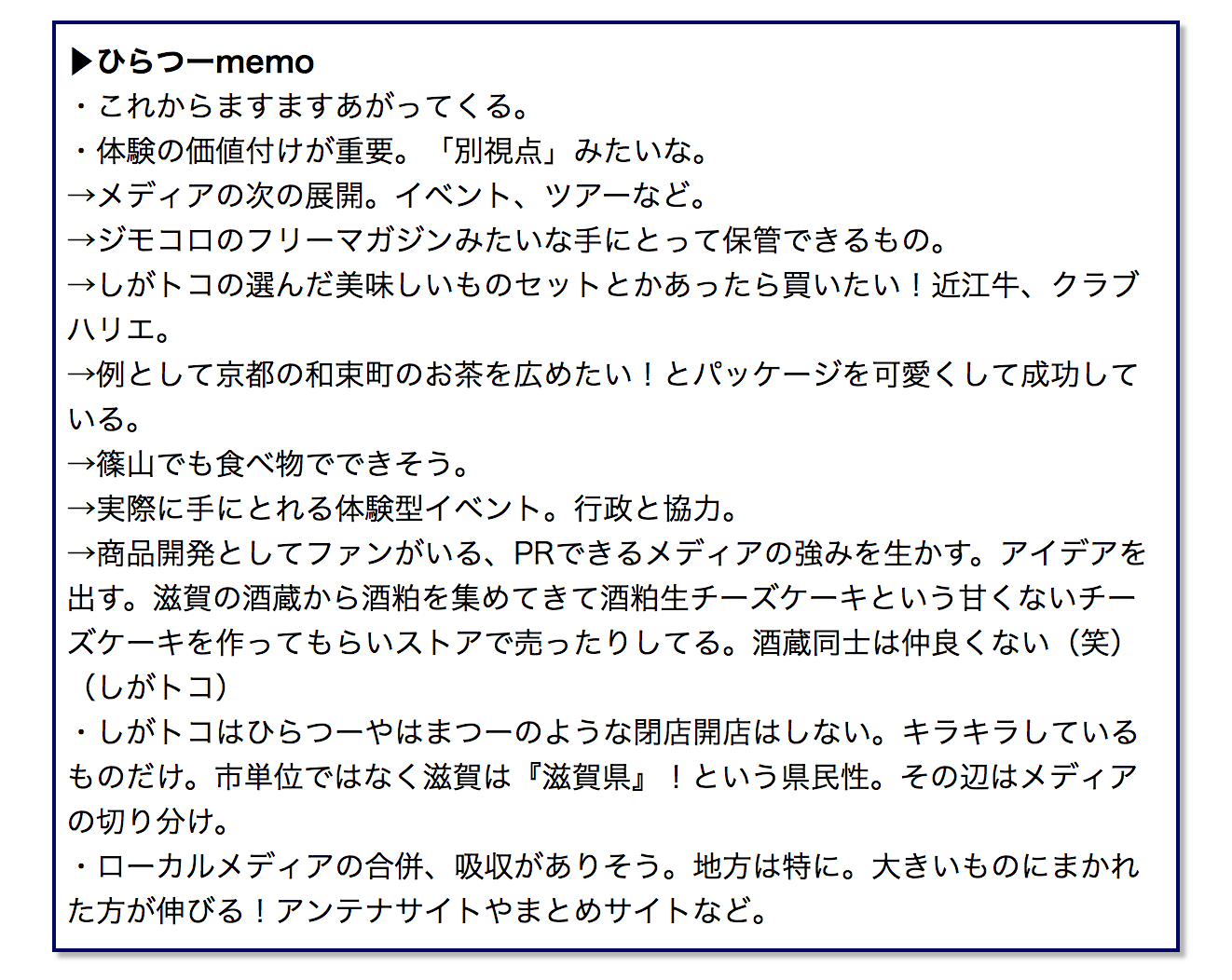 林:さっきのライターの話で言うと、テゲツーさんもそうかもしれないですけどアマチュアの人で滋賀のことを一生懸命発信するお手伝いしたいんですっていう人が多いんです。