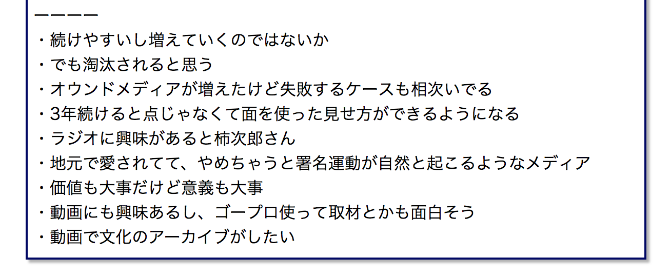 まぁ圧倒的にやめていく人の方が多いと思うんで。続けるためには体制づくり。要は最初は地域に特化していたのに途中でブレて広告寄りの世界になったりして、お金が見え過ぎたりすると元々のファンが離れるかもねとか。